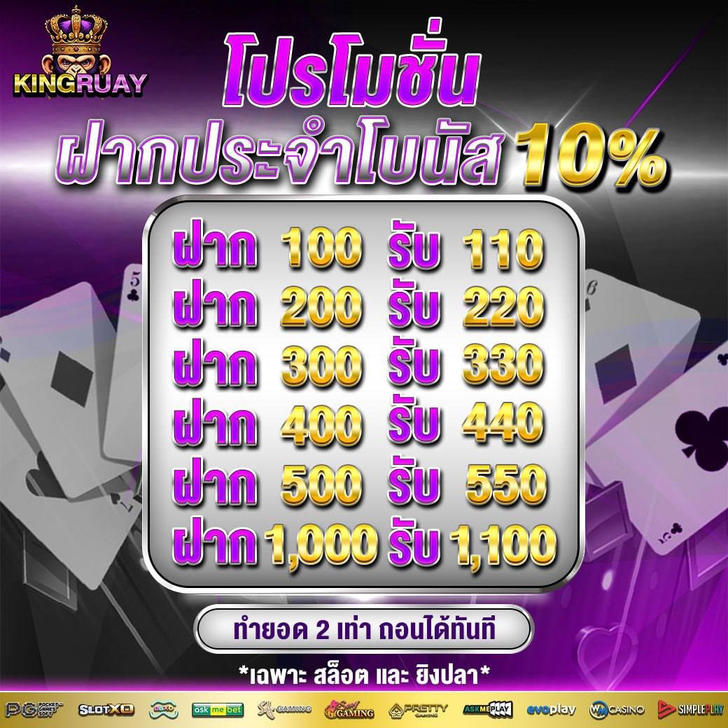 นอกจากนี้ kingruay ยังมีโปรโมชั่นพิเศษอื่น ๆ อีกมากมาย เช่น คืนยอดเสีย โบนัสวันเกิด และกิจกรรมแจกเครดิตฟรีตามเทศกาลต่าง ๆ ทำให้สมาชิกมีโอกาสได้รับเครดิตเพิ่มอยู่เสมอ